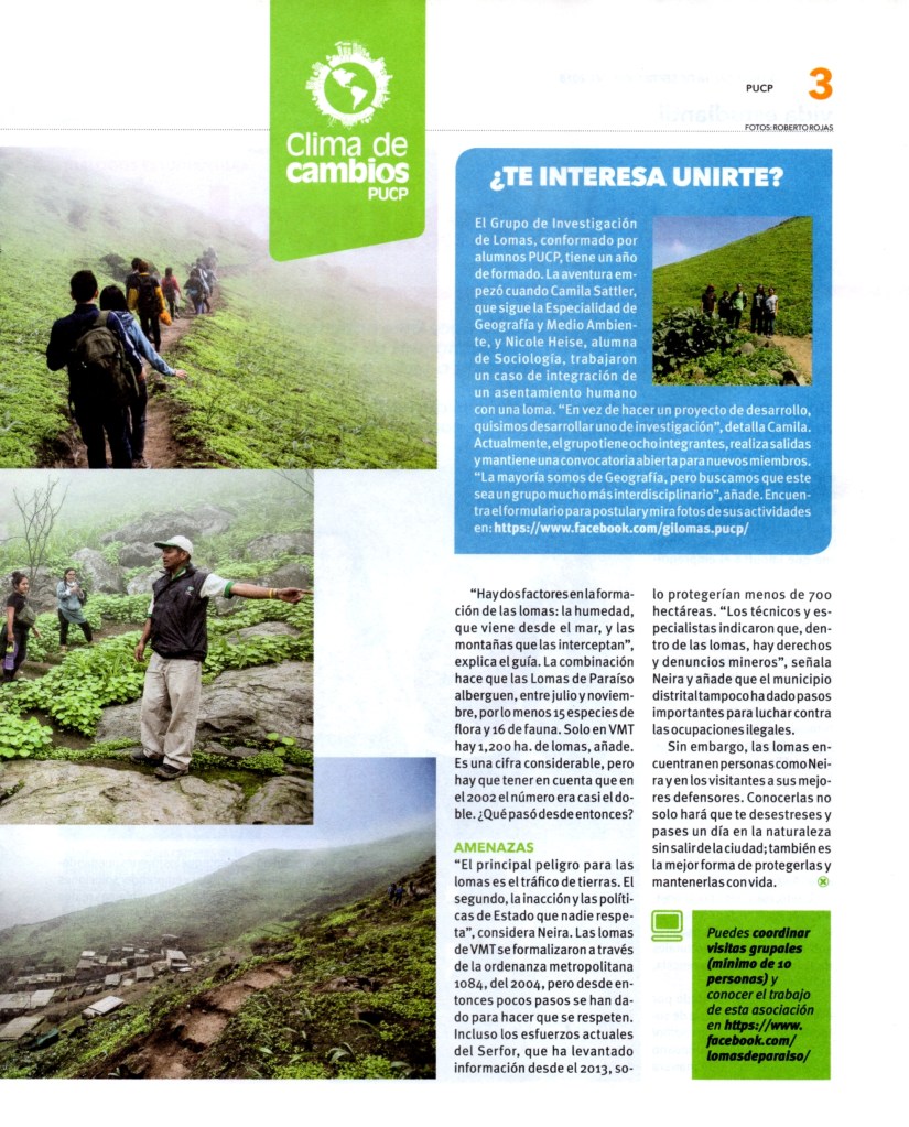 El motivo de esta entrada es compartir un reportaje que tenía en espera desde el año pasado, publicado en la revista Q, suplemento del semanario de mi universidad (PUCP), llamado PuntoEdu (un tiempo en que Q se lanzaba como documento independiente, pero acompañando al PuntoEdu; ahora, está integrada al semanario). A este momento, ya he escrito dos entradas sobre mis visitas a las Lomas de Paraíso (o Lomas de Villa María del Triunfo), correspondientes al 2012 y al 2018. El reportaje habla, justamente, de estas lomas. La correspondiente referencia bibliográfica es: