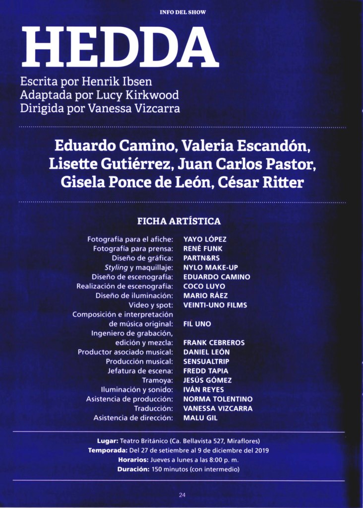 Hedda es una de las obras más interesantes que he llegado a ver. Me atrae mucho cómo está construido el personaje central, Hedda Gabler. Quizás, porque yo también he tenido la experiencia de conocer en el pasado a alguien de características equivalentes. Se trata de una psicología estudiada y una representación contundente del guion. En la actuación, Gisela Ponce de León, quien la interpreta, deja una puesta maravillosa. El resto del elenco, además, están lleno de nombres preponderantes en el contexto peruano. Sin embargo, mi enfoque en esta entrada está en Hedda.