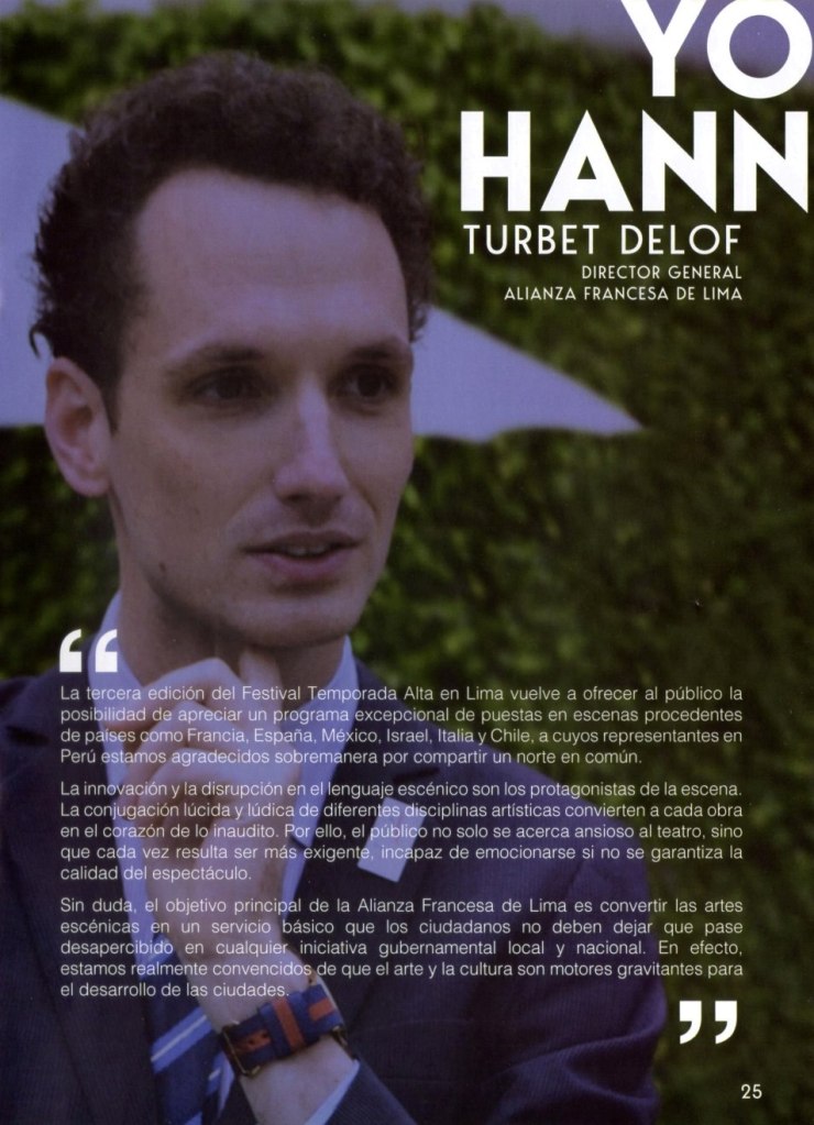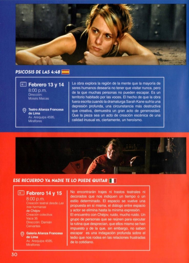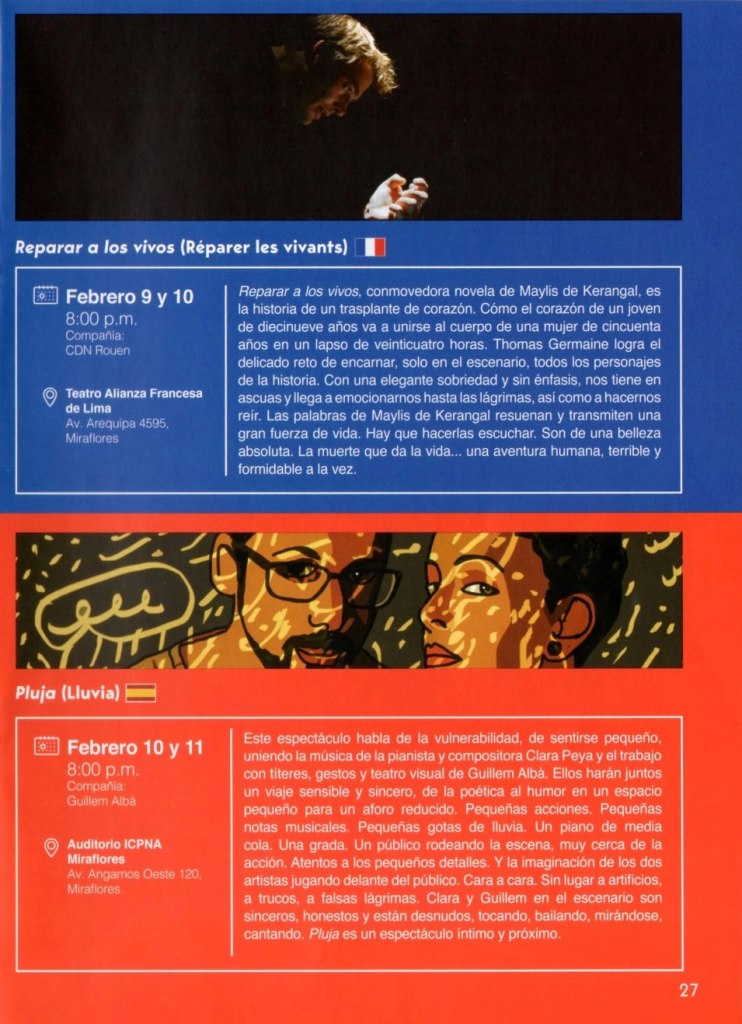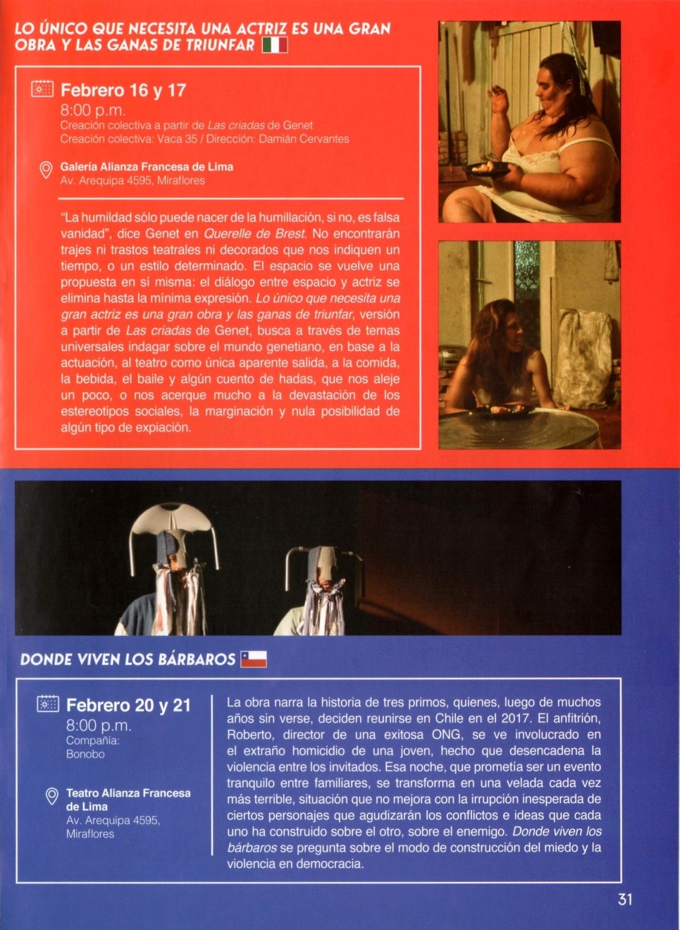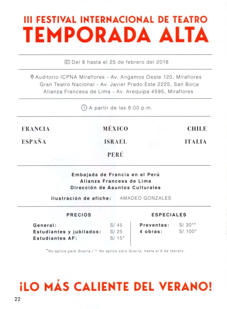 No obstante, remontándome una vez más a principios de 2018, del 8 al 25 de febrero el mencionado festival tuvo lugar. Al tratarse de la Alianza Francesa como la principal institución implicada en la organización, intuía que podía no tratarse de un teatro tendiente a una índole clásica, sino, para apoyarme en palabras que escuché una vez a Vania Accinelli en referencia a una obra llamada Oda a la Luna, más “no naturalista”. O, pensando en términos generales, un teatro basado en elementos creativos que no suelen ser de la línea mayoritaria de la cartelera (al menos, en Perú). El título, además, causaba intriga: “Temporada Alta”. ¿Cuál sería la relación entre este y las obras? Al momento, no la he hallado, pero me atrae experimentar con la novedad.