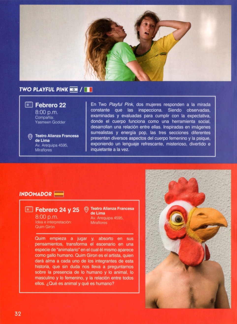 Cabe agregar que, mientras hacía fila para la sala (en el ICPNA) antes del inicio, vi pasar a Fiorella Pennano, una actriz cuyo trabajo admiro. Junto con Norma Martínez —actriz de renombre en mi país—, dirige Animalien, una productora de teatro que era parte de la organización del festival. Desde aquí, felicito su gran trabajo.