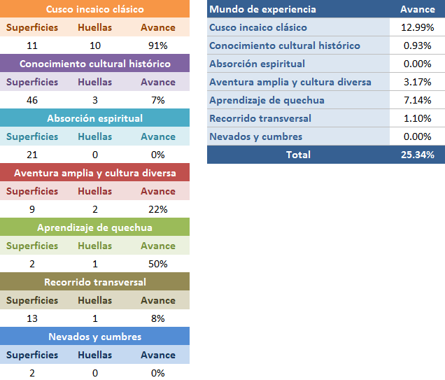 Ahora, luego de esta larga introducción, me dirijo a lo que inicialmente iba a comentar. Como ya he mencionado en esta otra entrada, este año terminé el programa Rimanakusun en Idiomas Católica, el centro de idiomas de mi universidad. Fue en mayo y, con ello, avancé un punto (50%) en la métrica de lo que di por llamar “Mundo de experiencia 5” de mi proyecto Cusco Infinito. Así, retornando a la matriz de avance que había presentado aquí, como se muestra en la imagen, he podido alcanzar y superar el 25%.