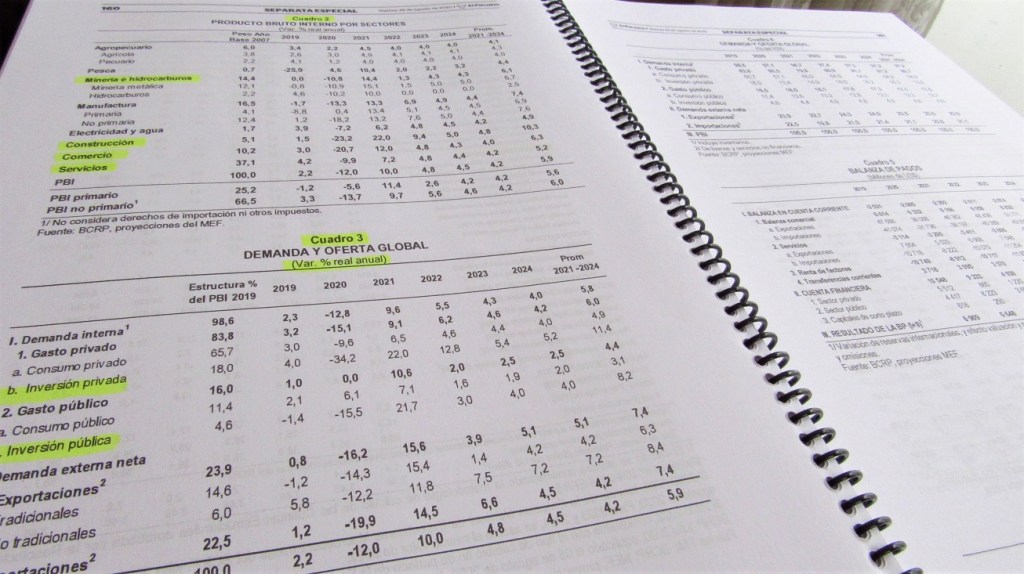 El documento más importante en el sector Economía y Finanzas del Perú se llama Marco Macroeconómico Multianual (MMM). Debe publicarse cada año en agosto con las proyecciones económicas y financieras para los siguientes cuatro años. Asimismo, cada abril del primer año de dicho rango deben ser actualizadas. Según este procedimiento, el año pasado, el MMM 2021-2024 fue aprobado el 26 de agosto y publicado el 28, dos días después. Igualmente, el 30 de abril del presente año se publicó el informe de actualización respectivo.