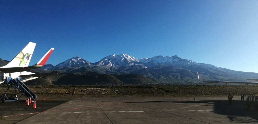 Mientras caminábamos del avión hacia las instalaciones, Chachani se visualizaba hermoso. Pensar que he alcanzado tres veces la cumbre de esa montaña (y un intento adicional que fue fallido, ya hace una cantidad de años), genera un suspiro. Ahora estaba allí, completamente desplegado, pintado de blanco, esplendoroso. Quién sabe si volveré a subirlo. Fue mi primer 6000 y aprendí mucho de su recibimiento a mi persona, de su frío y de las vistas y sensaciones de gloria de estar en su cumbre, pero necesito estar siempre buscando nuevos horizontes.