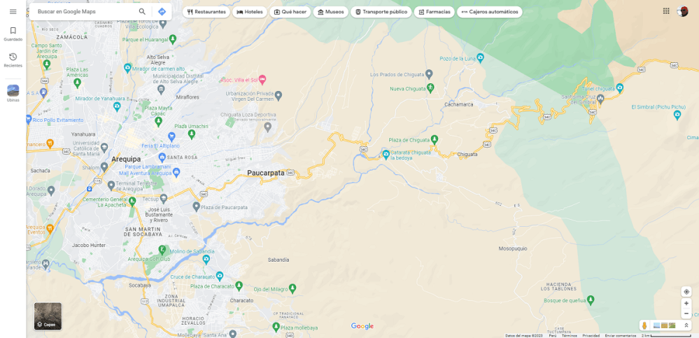 Entonces, ahí estábamos, con un auto repleto y camino a la aventura. Aún en la ciudad, pasamos por un mercado para comprar provisiones adicionales. Por mi parte, frutos secos y, por parte de Norma, algunas presas de pollo. Cruzamos el distrito de Paucarpata con dirección hacia el distrito de Chihuata. La línea amarilla del mapa es la que seguimos para llegar hasta la montaña. Al llegar a la laguna de Salinas, ubicada en un extremo de la Reserva Nacional de Salinas y Aguada Blanca, tomamos la ruta derecha en la bifurcación, y continuamos hasta cruzar de Arequipa a Moquegua. Finalmente, al alcanzar las cercanías de la montaña, tomamos un desvío a la izquierda y continuamos subiendo hasta el punto de campamento. No obstante, en todo el trayecto, hicimos algunas paradas.