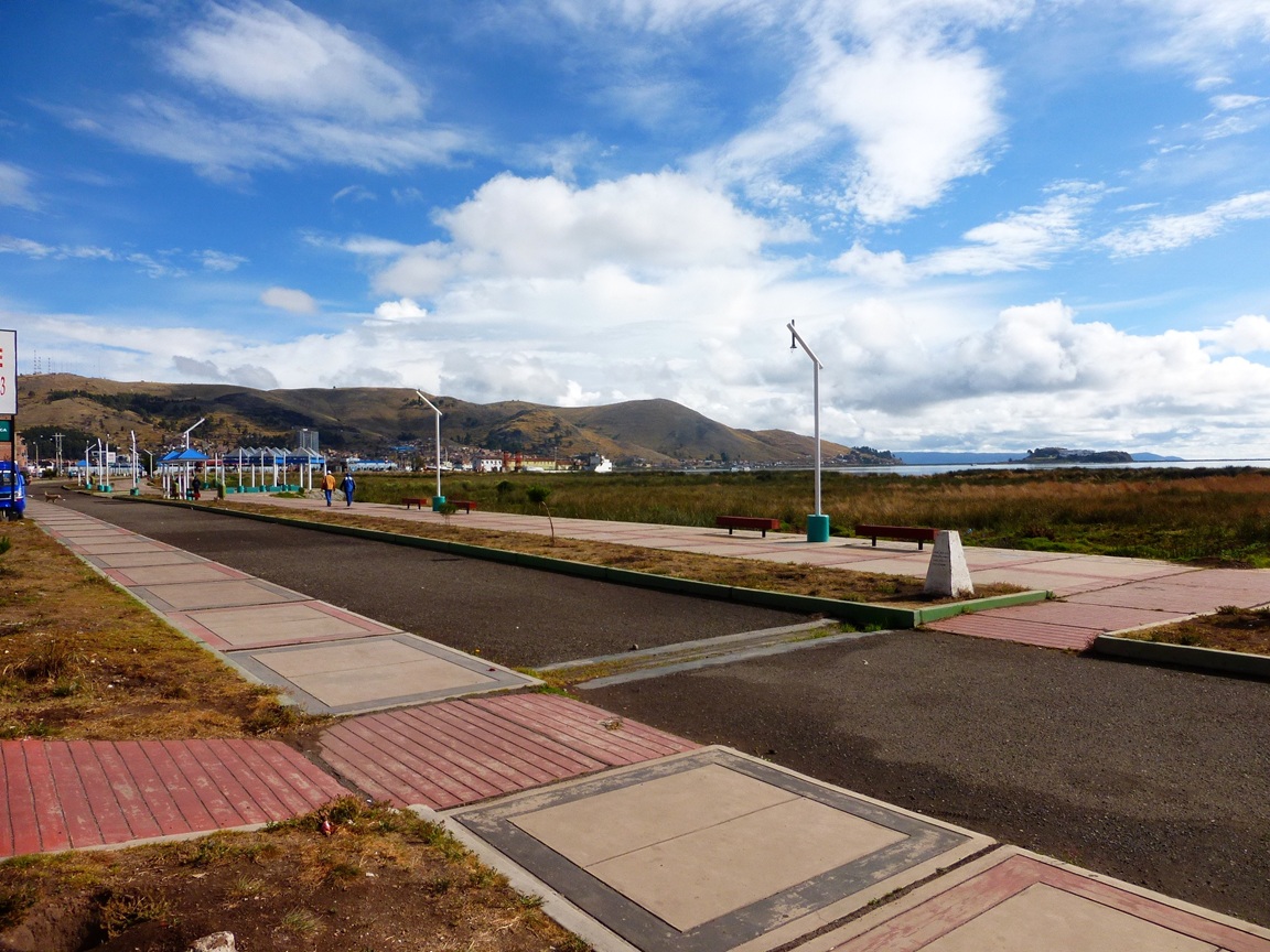 Salimos del pasaje caminando hacia la Costanera. Subimos al vehículo y había otros viajeros más allí, incluyendo una pareja colombiana. En el camino, subieron algunos más. ¡Suena como si se hubiese tratado de un largo recorrido! Pero no: fueron solo tres míseras cuadras (claro, para nosotros). Bajamos y avanzamos a pie hacia el puerto por el jirón Titicaca. Llegamos a la Plaza del Faro e ingresamos al puerto. Esperamos un momento allí tomando fotos mientras ordenaban las lanchas para que pudiéramos pasar por encima de ellas, en fila, hasta llegar a la nuestra, la más alejada.