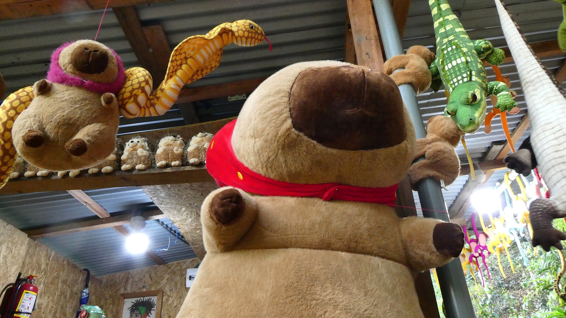 Nos alejamos hacia el noreste de Villa Rica para llegar al espacio formado alrededor de la cascada El León, con piscinas naturales que la gente puede disfrutar. Hay caminitos que las rodean internamente y un puente colgante. Además, baños, vestuarios y puestos de venta de suvenires. Uno tenía un tremendo capibara.