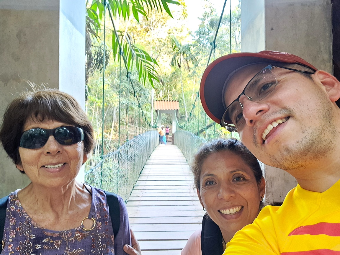 No fuimos hacia la parte baja, a la altura de las piscinas, con el resto, sino por un borde hasta desembocar en un área elevada donde podíamos apreciar un panorama distinto. Nos sentamos entre las rocas para refrescarnos, ya que el agua de la cascada fluía por ellas. Tomamos algunas fotos y continuamos andando hasta cruzar el puente colgante.