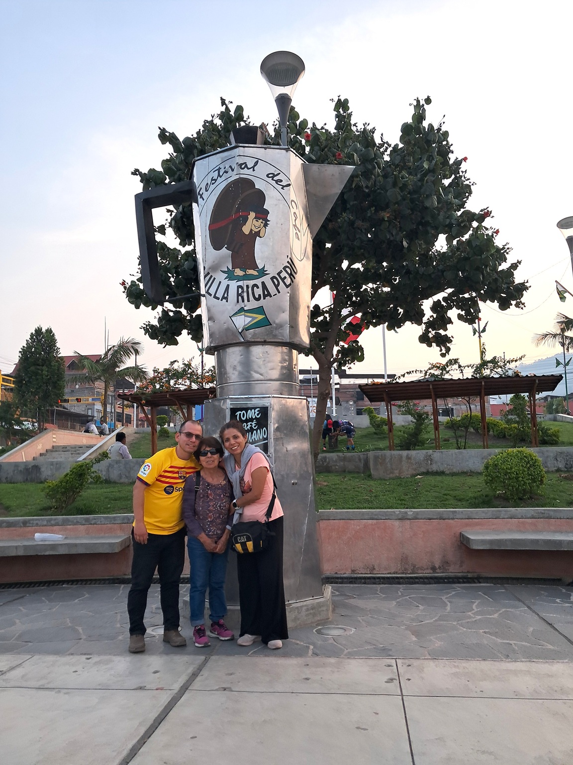 Para finalizar el programa, bajamos y nos introdujimos en la Plaza de Armas, donde hicimos fila para fotografiarnos con un monumento en forma de cafetera. Me pareció un parque muy agradable y, a esa hora, fresco. Tampoco había mucho movimiento alrededor.