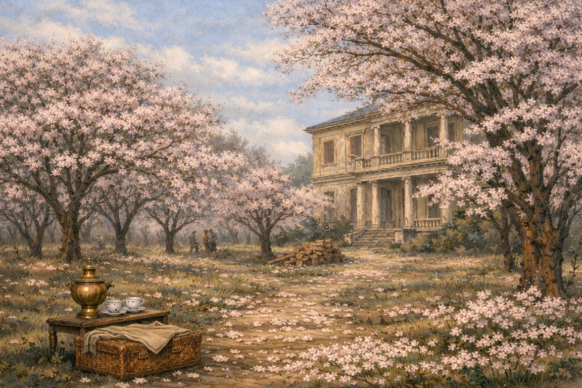 La obra muestra cómo la familia, atrapada en sus recuerdos y en su visión romántica del pasado, es incapaz de adaptarse al nuevo orden económico y social. Lopajin insiste en cortar el jardín de los cerezos, símbolo de la antigua Rusia aristocrática, y modernizar la finca. Finalmente, la propiedad se subasta y Lopajin la compra, triunfando el pragmatismo burgués sobre la decadente nobleza.